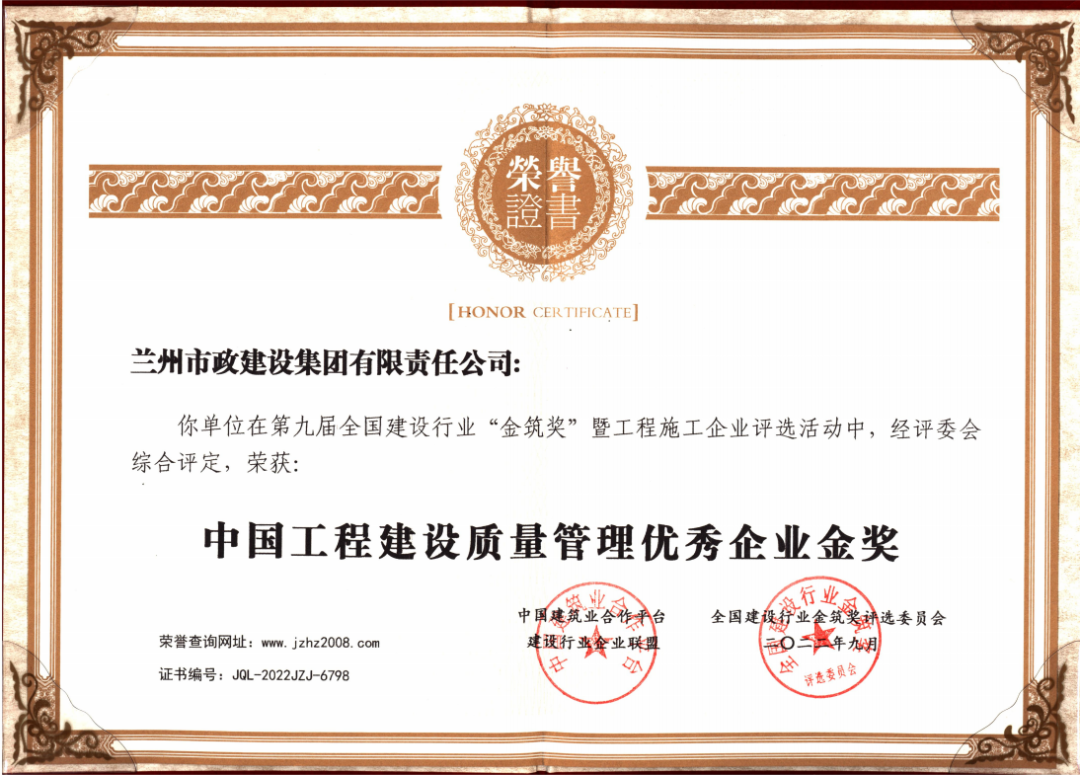 “金筑獎(jiǎng)”是由中國建筑業(yè)企業(yè)合作平臺(tái)、全國建筑業(yè)金筑獎(jiǎng)評(píng)選委員會(huì)聯(lián)合頒發(fā)的年度獎(jiǎng)項(xiàng),素有中國建設(shè)行業(yè)的“奧斯卡”之稱。此次“金筑獎(jiǎng)”暨工程施工企業(yè)評(píng)選中,公司獲得“中國工程建設(shè)質(zhì)量管理優(yōu)秀企業(yè)金獎(jiǎng)”。據(jù)統(tǒng)計(jì),公司近年來已獲得上百項(xiàng)各層級(jí)的質(zhì)量獎(jiǎng)項(xiàng),其中全國優(yōu)質(zhì)工程獎(jiǎng)1項(xiàng)、“魯班獎(jiǎng)”3項(xiàng),中國市政示范工程“金杯獎(jiǎng)”6項(xiàng)。